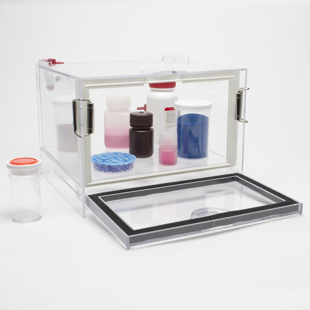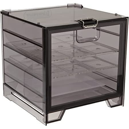 Ideal for minimal spaces. It is clear on all sides. Includes 2 shelves and vent holes. Four shelf rails for adjusting heights.  Unit is smoke-tinted colour. The doorway is airtight when shut and when it is opened it slides into a hide-away compartment underneath the cabinet. Securely stackable up to five high.