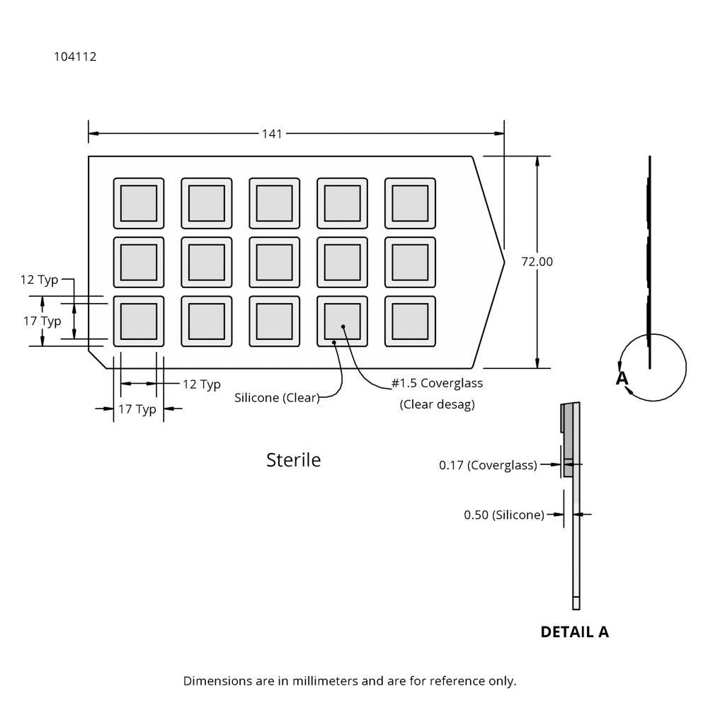 The coverglass is affixed to a thin microscopically transparent silicone base which secure to culture vessels by an electrostatic charge, not an adhesive, to prevent movement during cultivation.